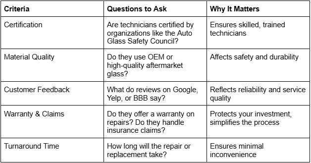 Remember: Your vehicle’s safety depends on quality repairs. Take the time to choose the right auto glass company—your car, safety, and wallet will thank you.